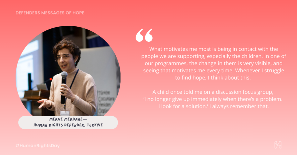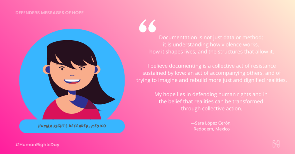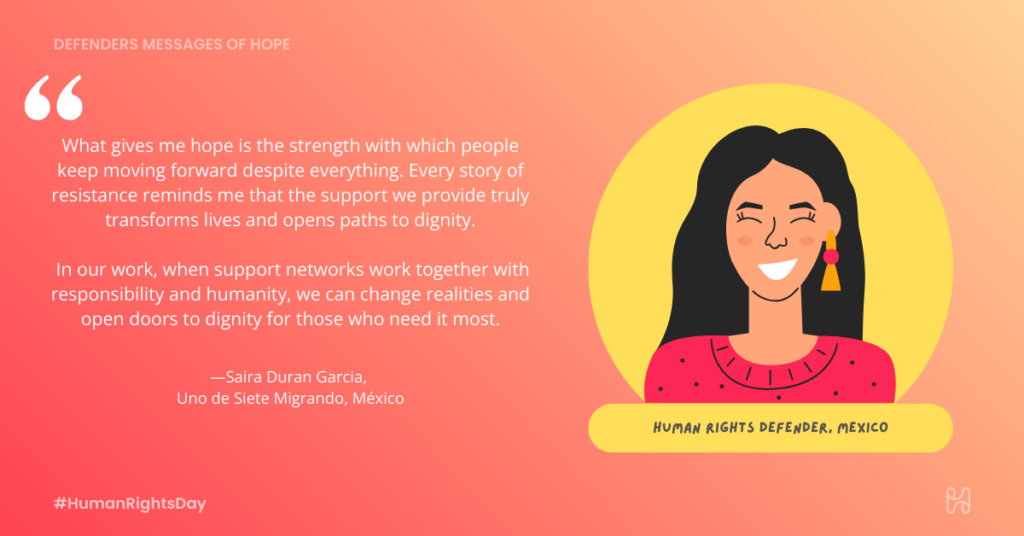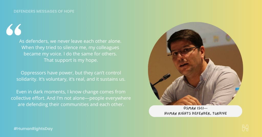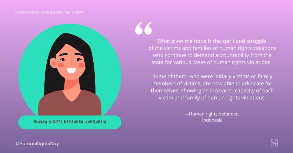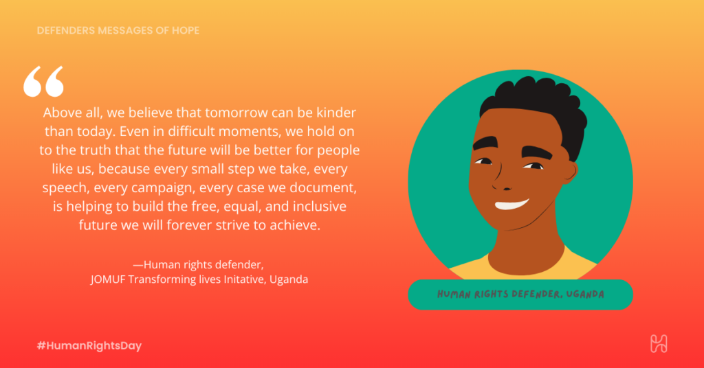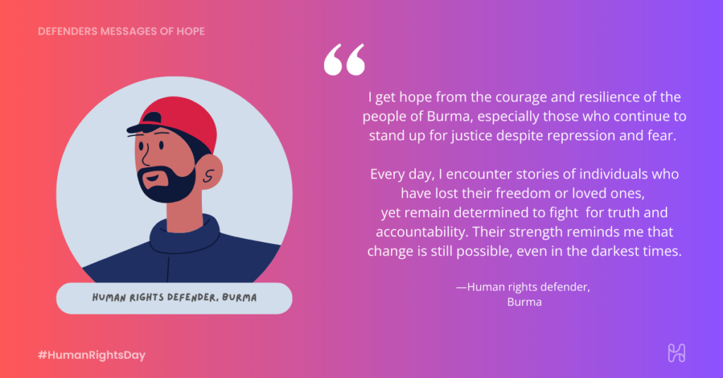 This year, we are celebrating Human Rights Day by sharing messages of hope from human rights defenders around the world. Despite shrinking civic space and growing pressure, defenders continue to document violations, support their communities and pursue justice.